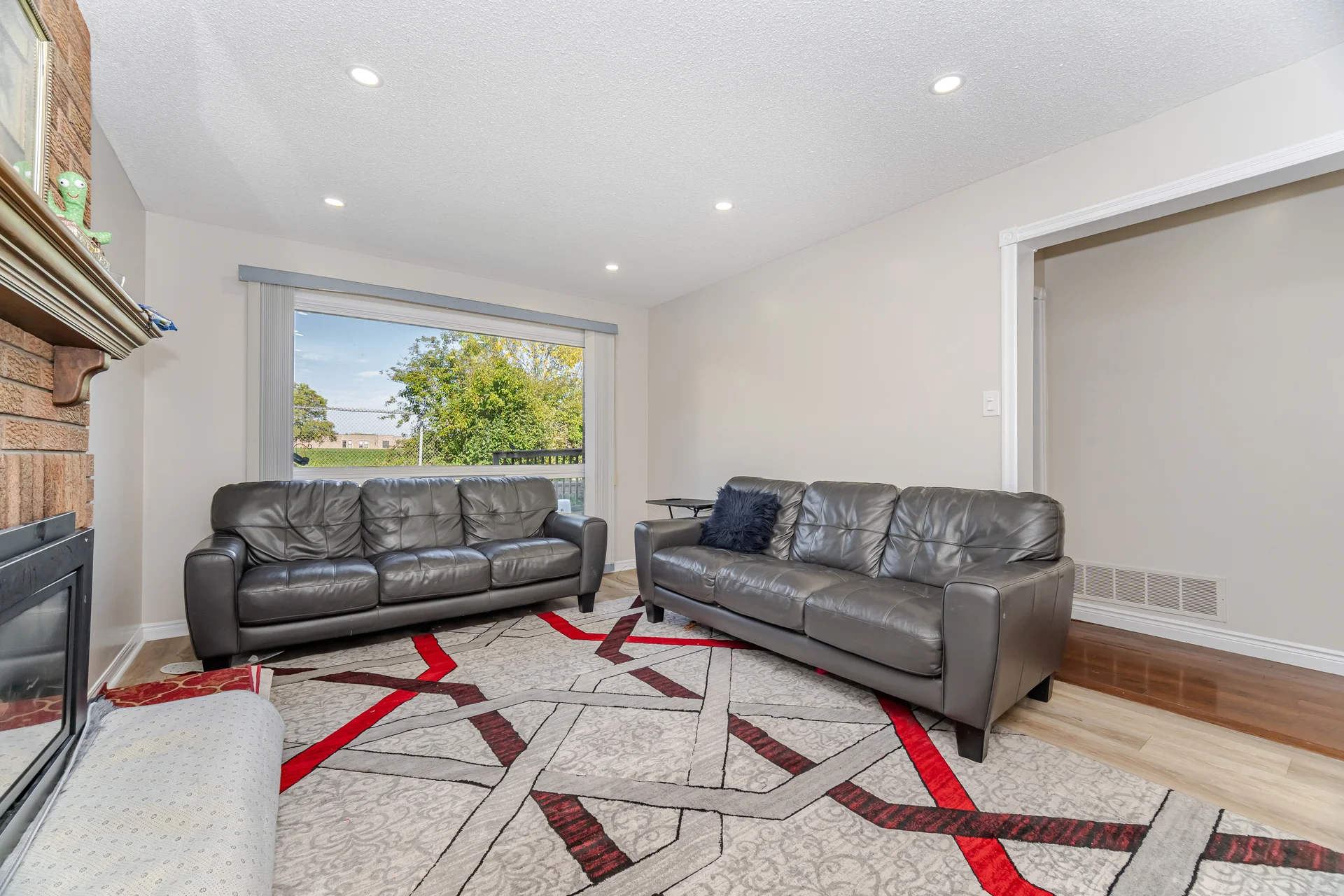 Fireplace, hardwood, large windows |